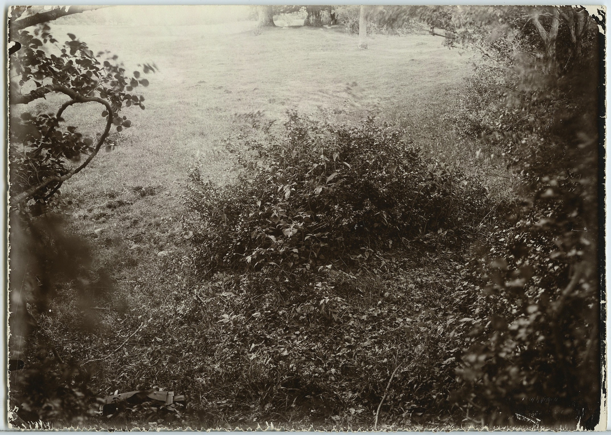 'Häckplatsen för törnsångare, öppen plats med träd och buskar omkring. Längst ner i vänstra hörnet ligger ett föremål, möjligen någon form av väska. :: :: Se även fotonr. 12.'