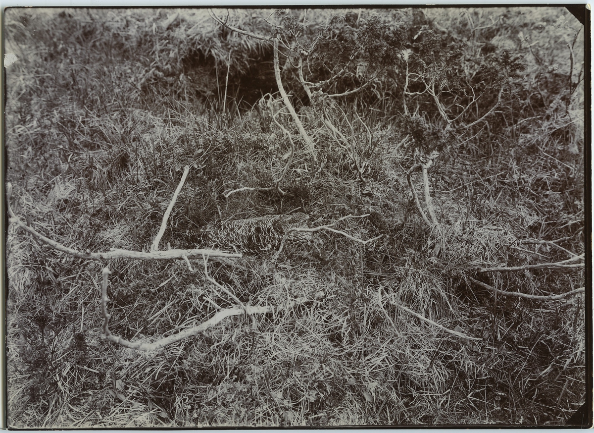 'Fjällripa på redet i ört- och gräsvegetation. :: :: Ingår i serie med fotonr. 106-127.'