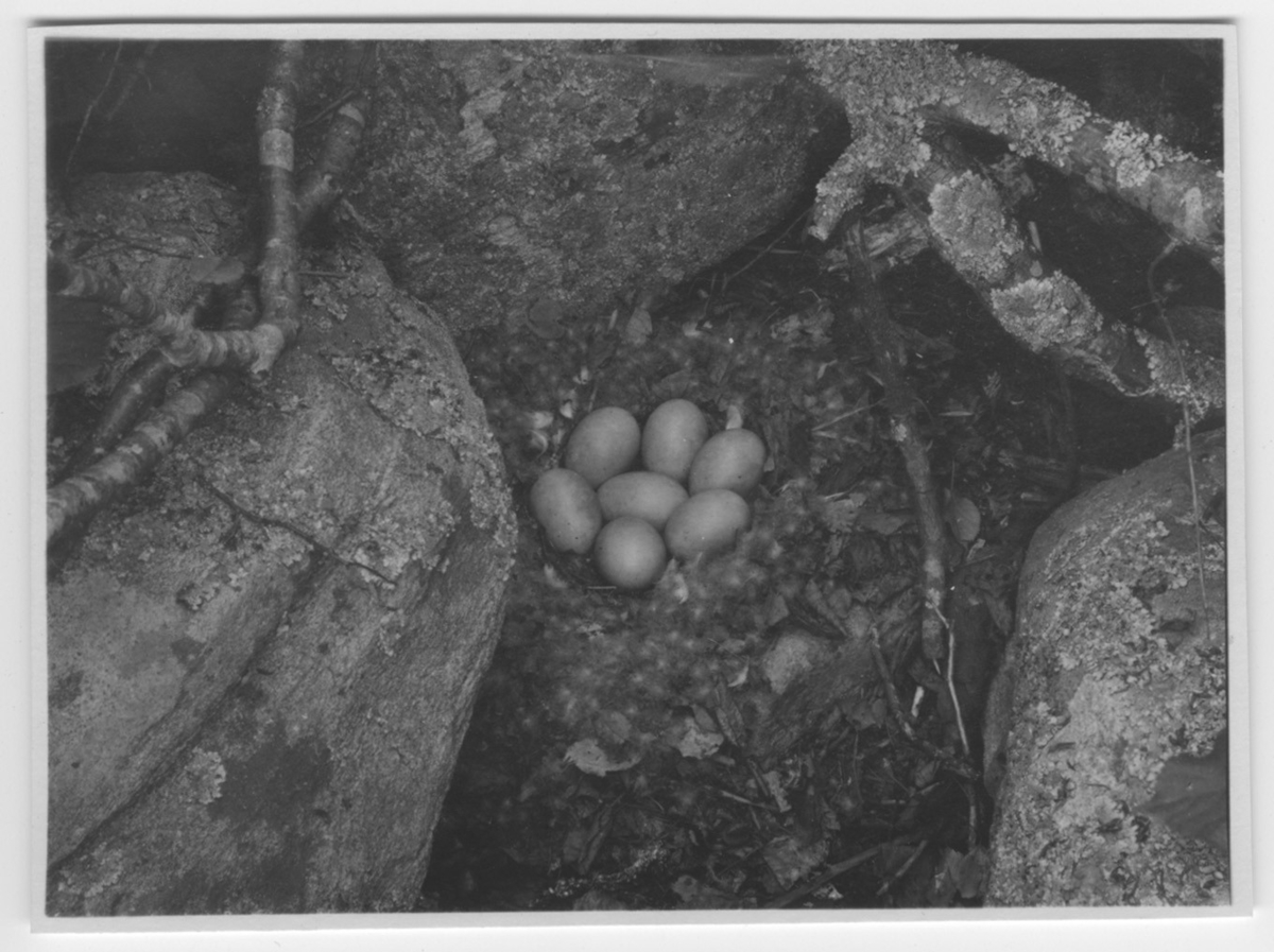 'Storskrake, bo med 7 ägg mellan stenblock. :: :: Se serie med fotonr. 1174-1187.'