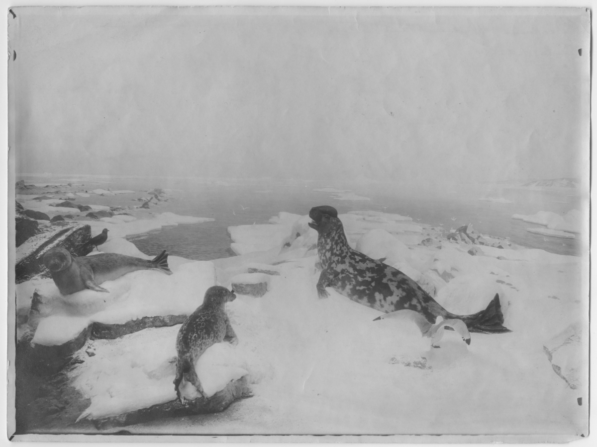 'Arktiskt landskap med 3 sälar och fåglar på isblock. Diorama i Museum Senckenberg, Frankfurt. :: :: Ingår i serie med fotonr. 1226-1230.'