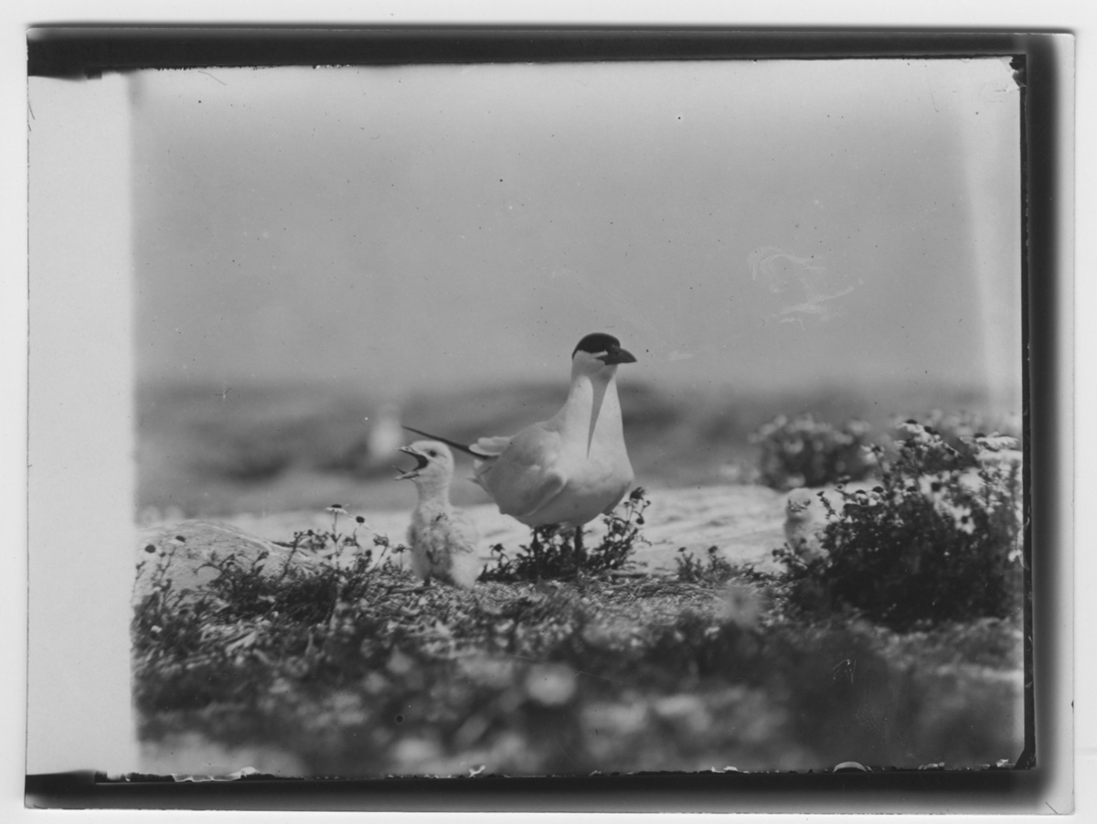 'Skräntärna med minst 2 st dunungar. :: :: Ingår i serie med fotonr. 1232-1246.'