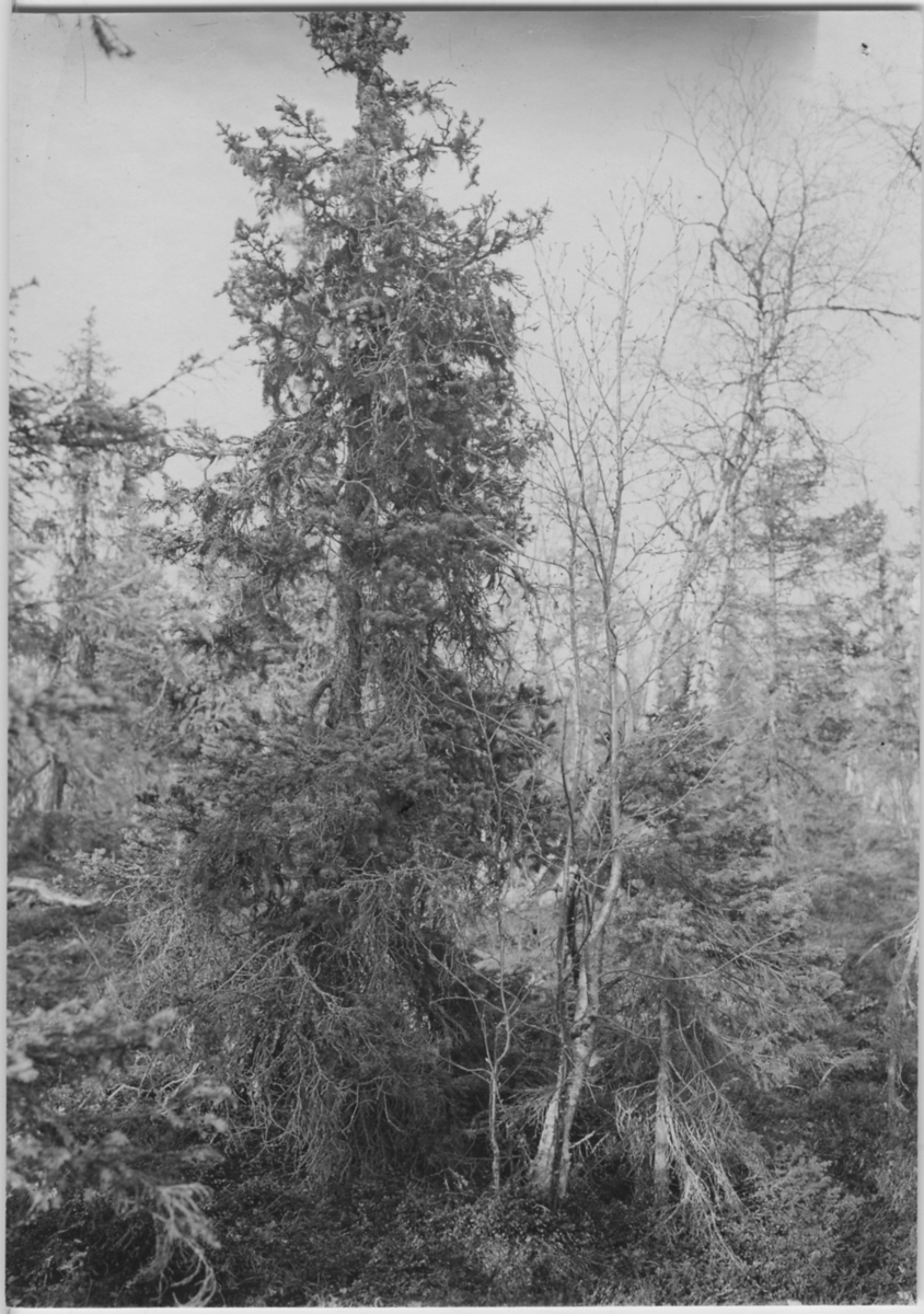 'Häckningsplatsen för varfågeln, stor gran. Boet i trädet. Vinterlandskap. :: Se fotonr. 128-129. :: :: Ingår i serie med fotonr. 128-148.'