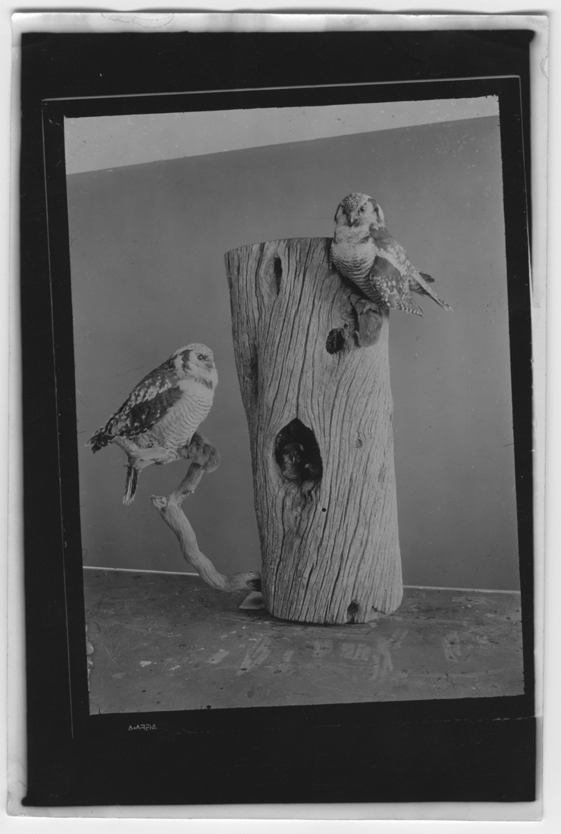 'Hökuggla, hona och hane med bo och ungar. Monterade på bit av trädstam. Fynddatum: 1927-06-12. :: :: Bilden med i Göteborgs Naturhistoriska museums Årstryck 1929 s.21.'