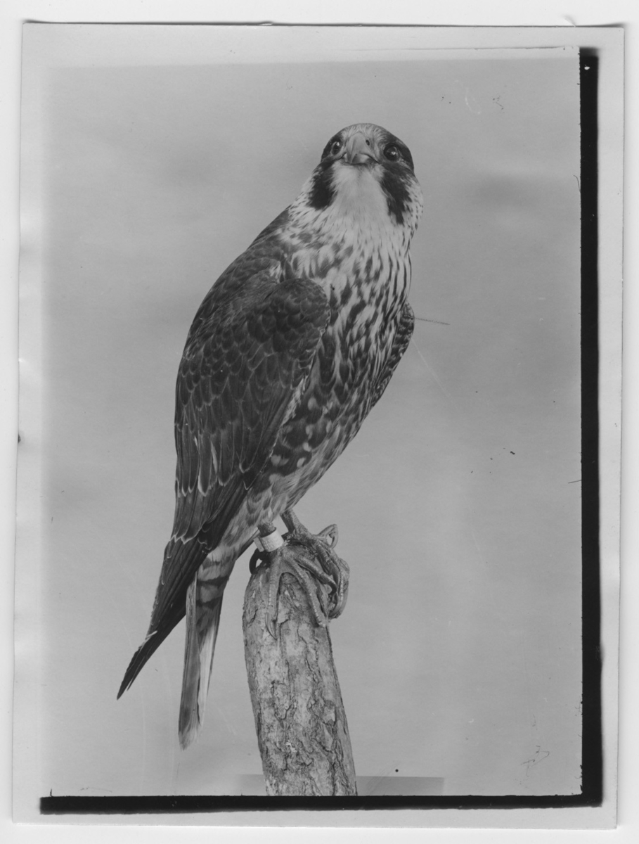 'Pilgrimsfalk, hona. Ringmärkt 923E Göteborg Sweden. Coll.an. 5382. Sedd snett från sidan, monterad på gren. :: :: Se fotonr. 1399-1401.'