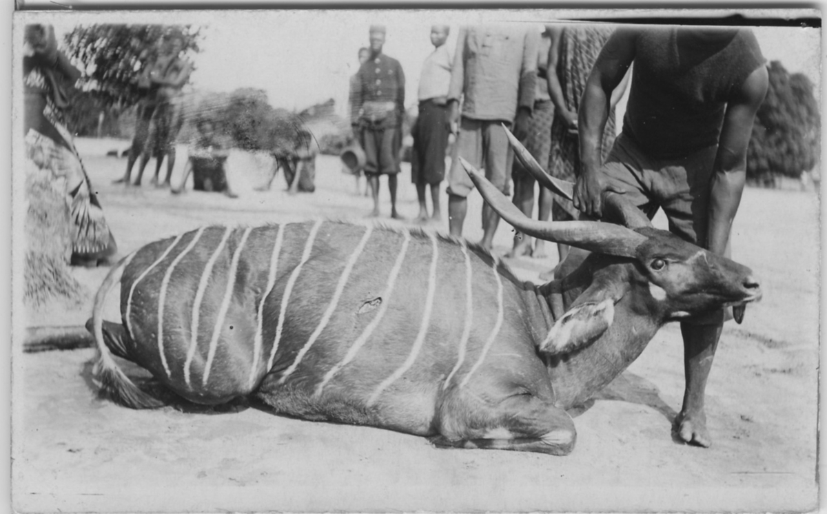 Bongoantilop. Liggande. En man håller i horn och huvud. I bakgrunden ac 10 personer, kvinnor och män.