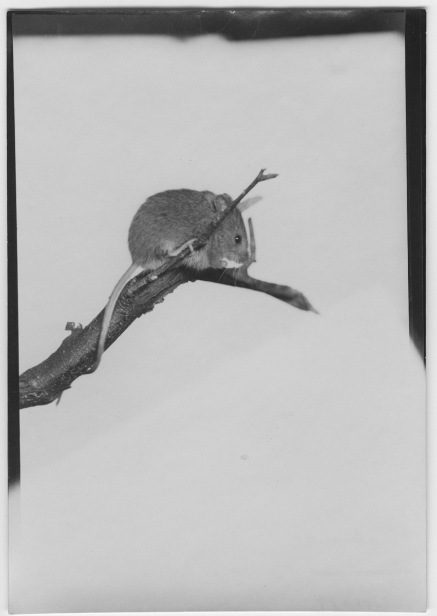 'Buskmus, hane, på en gren. :: :: Ingår i serie med fotonr. 1473-179.'