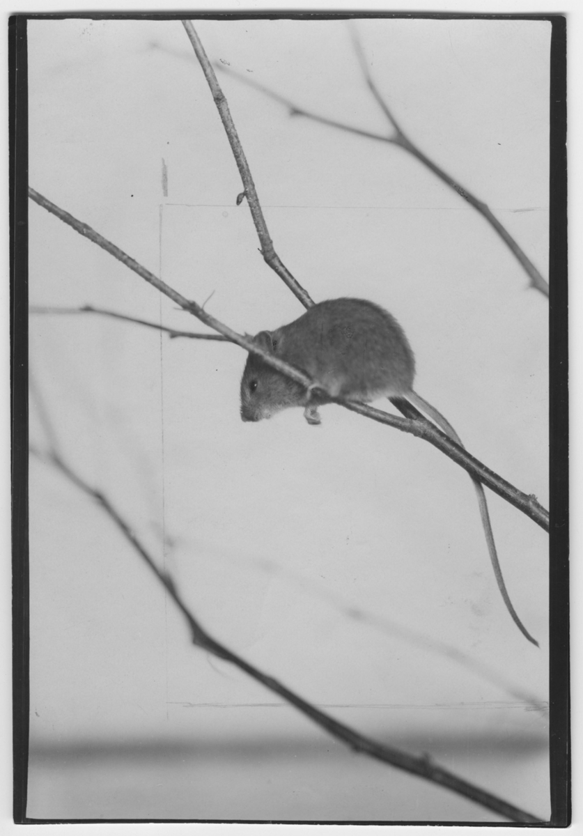 'Buskmus, hane, på en gren. :: :: Ingår i serie med fotonr. 1473-179.'