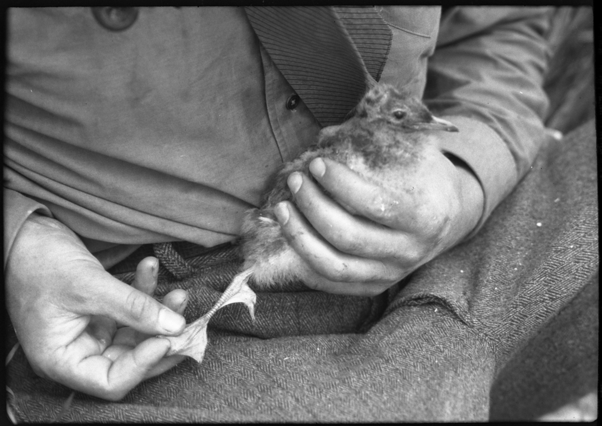'Fotografier tagna av konservator David Sjölander på Gotland sommaren 1929 och under Akka-expeditionen maj 1929: :: :: Skrattmås med en extra tå, i en människohand. :: :: Ingår i serie med fotonr. 1760-1769.'