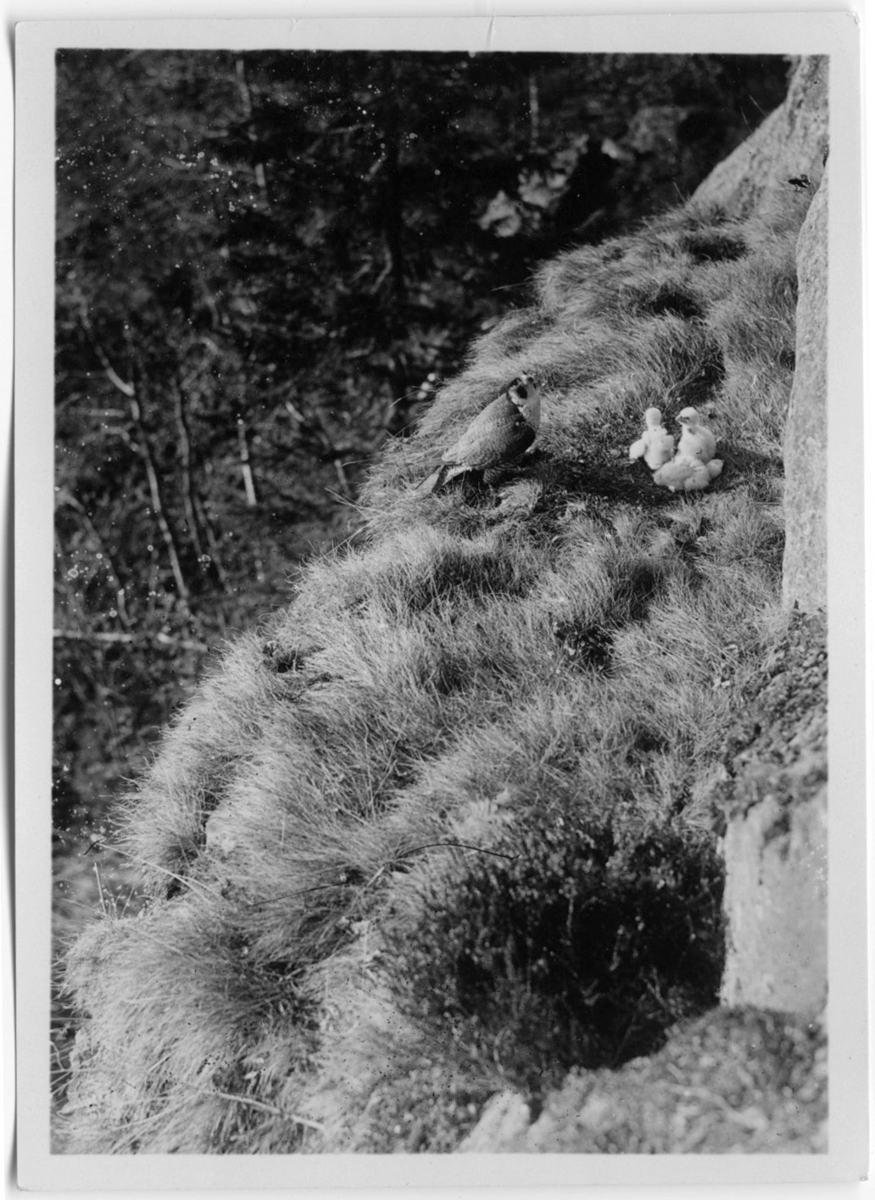 'Pilgrimsfalkhane med minst 2 ungar på gräsbevuxen klipphylla intill bergvägg. :: :: Ingår i serie med fotonr. 1771-1837. Se även fotonr. 3151-3200.'