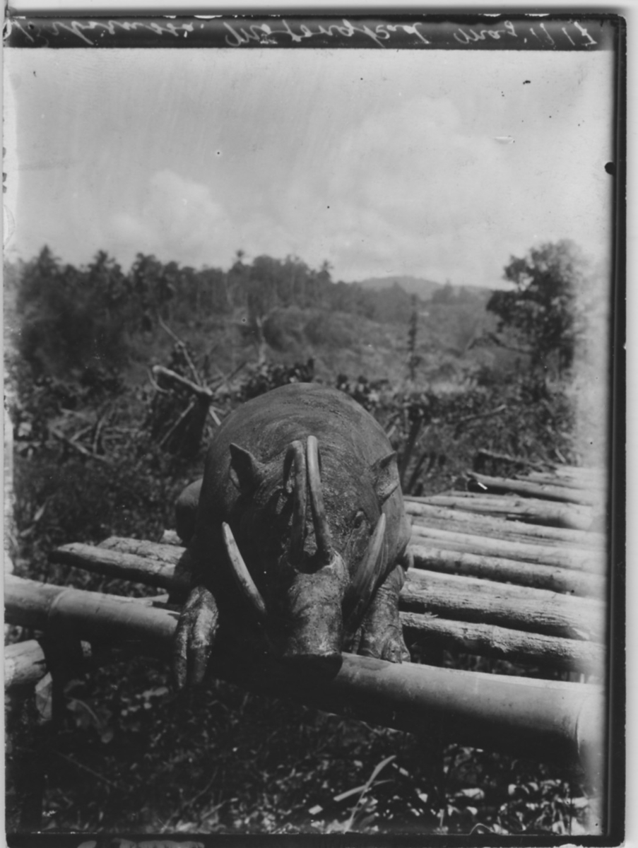 'Fällt hjortsvin sett framifrån, liggande på surrade slanor. :: Hjortsvin som finns monterade på Göteborgs Naturhistoriska museum i grupp med 3 st djur: Ma.ex.926, Ma.ex.927 och Ma.ex.928. :: :: Ingår i serie med fotonr. 185:1-3.'