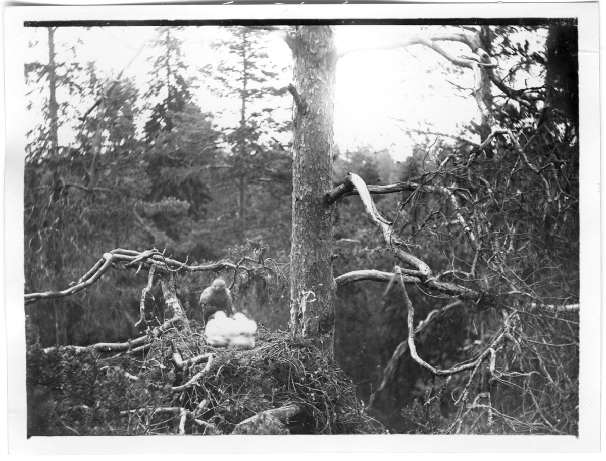 'Ormvråk med dunungar i boet i tall. :: :: Ingår i serie med fotonr. 1873-1887. Se även fotonr. 2562.'