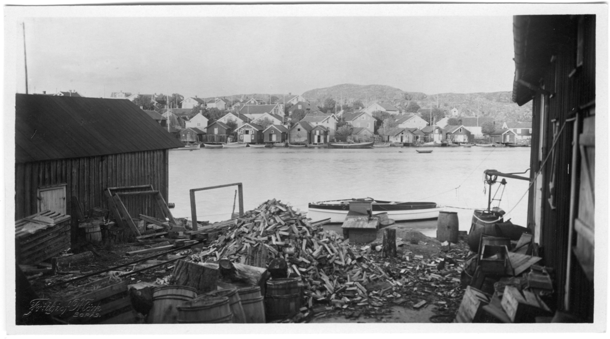 'Åt östsidan. I förgrunden en vedhög. Tunnor. Hus. :: :: Serie fotonr 1888-1963.'