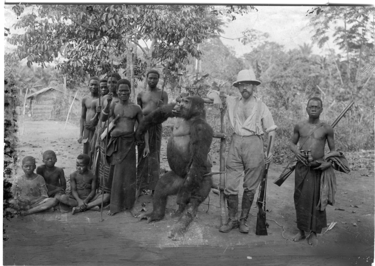 'Gorilla fastsurrad upprätt i träställning, omgiven av 9 st män varav 1 st bär gevär och kikare samt 1 st man med gevär. Kläder. Klädsel. :: :: Ingår i serie med fotonr. 1975-1997.'