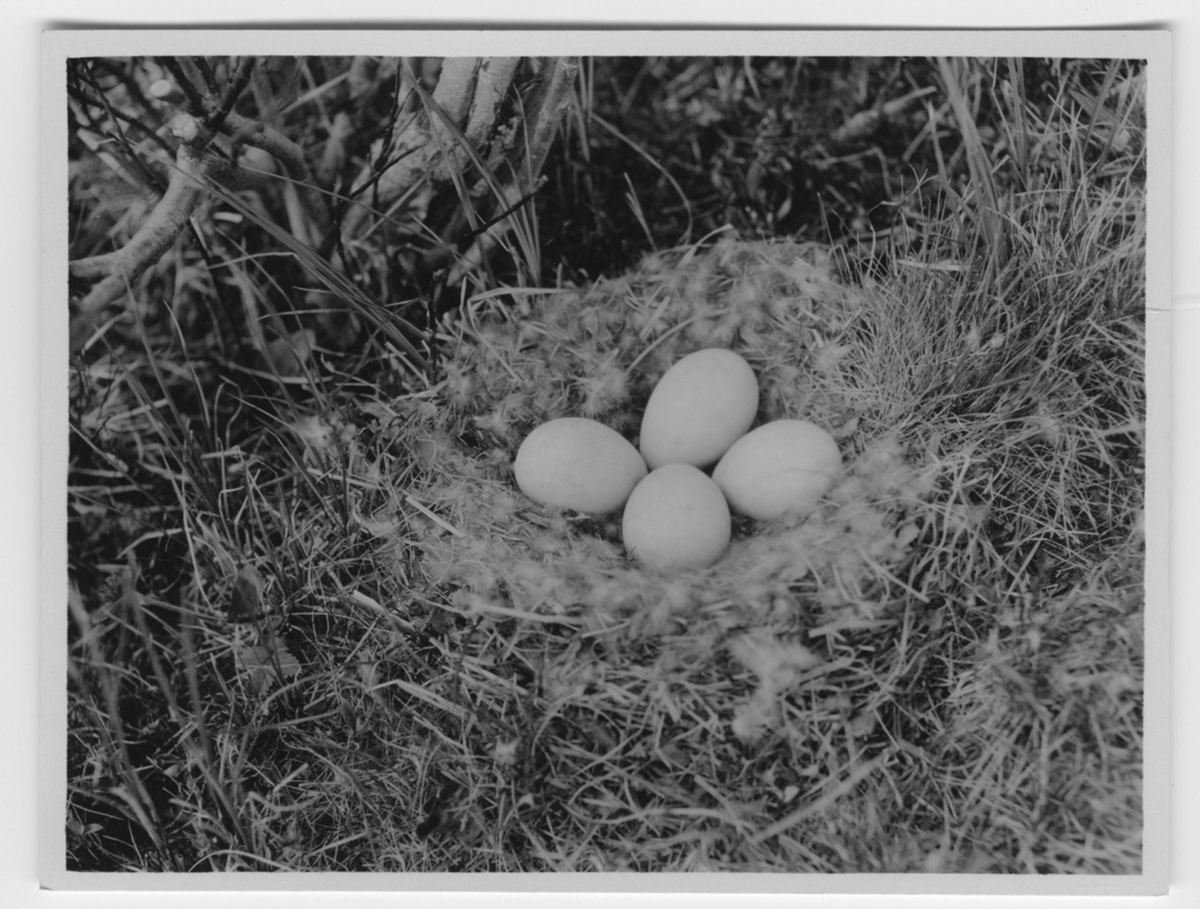 '4 st ägg av fjällgås invid buske i gräsvegetation. Närbild. :: :: Ingår i serie med fotonr. 2116- 2160. Se fotonr. 1469, samma motiv.'