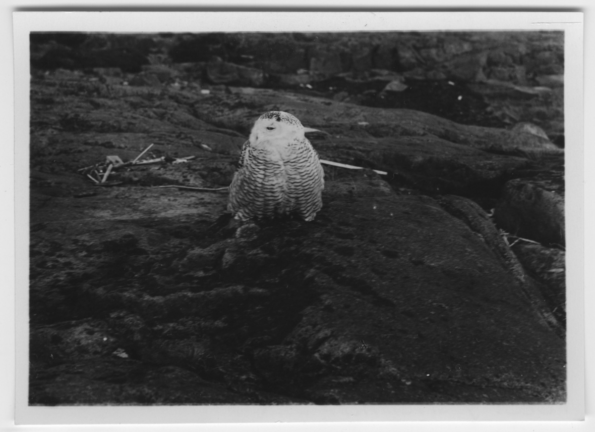 'Fjälluggla sittande på berghäll, närbild sedd framifrån. :: :: Ingår i serie med fotonr. 2266-2271.'
