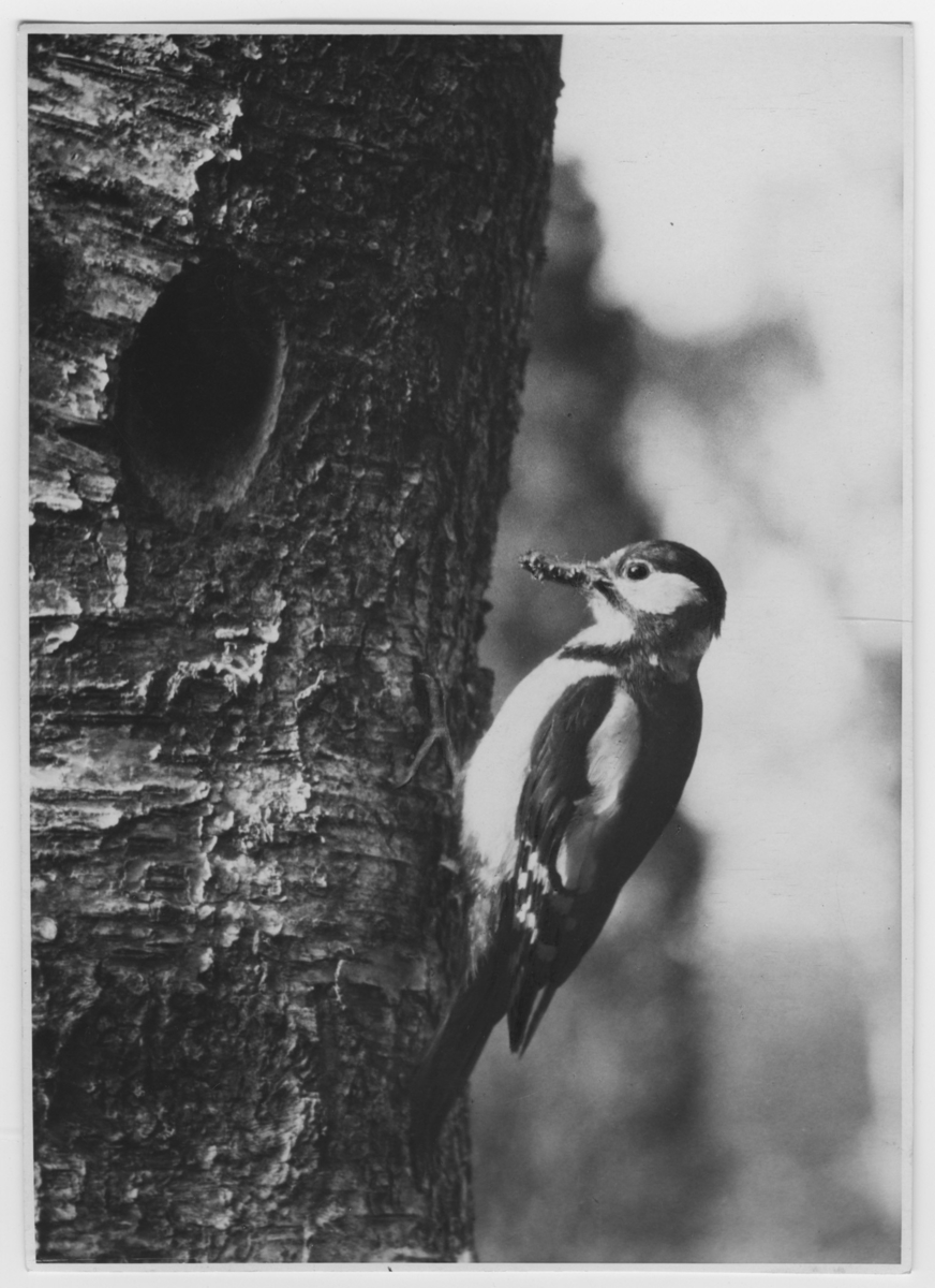 'Större hackspett vid boet i trädstam. Larver i näbben. Närbild. :: :: Ingår i serie med fotonr. 2272-2304.'