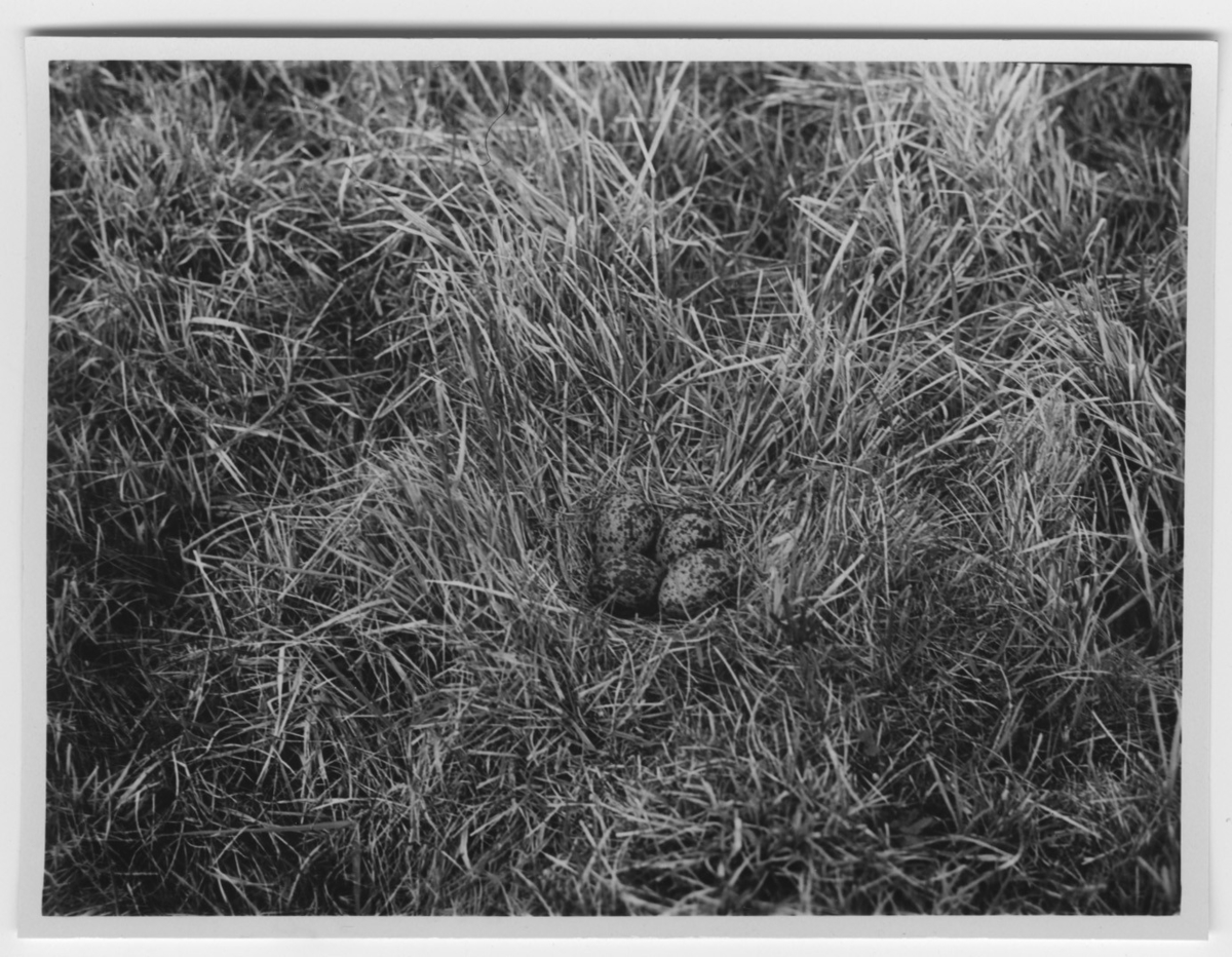 'Bo med 4 st ägg av tofsvipa. Närbild. :: Text på baksidan: ''Ett typiskt vipbo. Ca 20 par vipor häckade på strandängarna i norr och väster. De första äggen funnos den 26 april, innan snön ännu försvunnit.'' :: :: Ingår i serie med fotonr. 2305-2346.'
