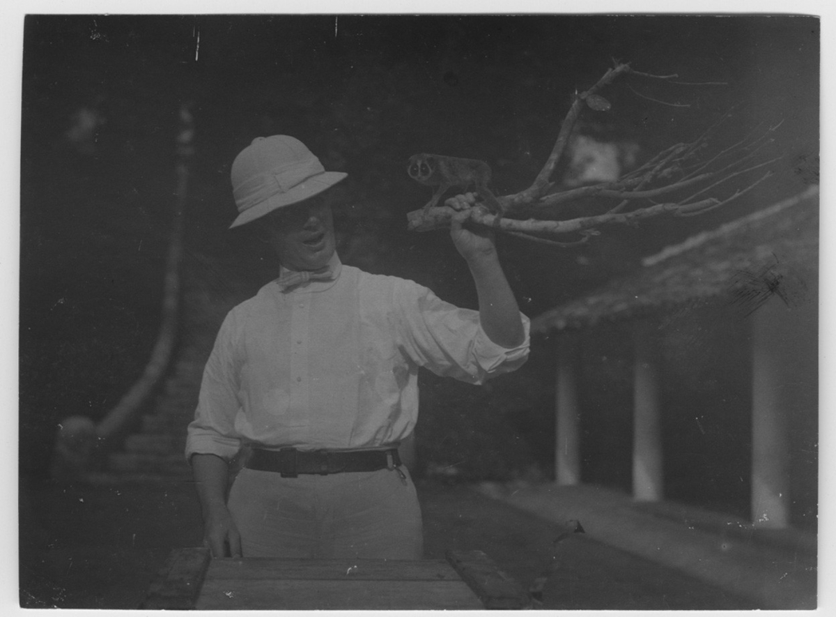 'Apa i fångenskap. 1 man håller en gren med en liten apa. :: :: Se fotonr. 235:1-2.'