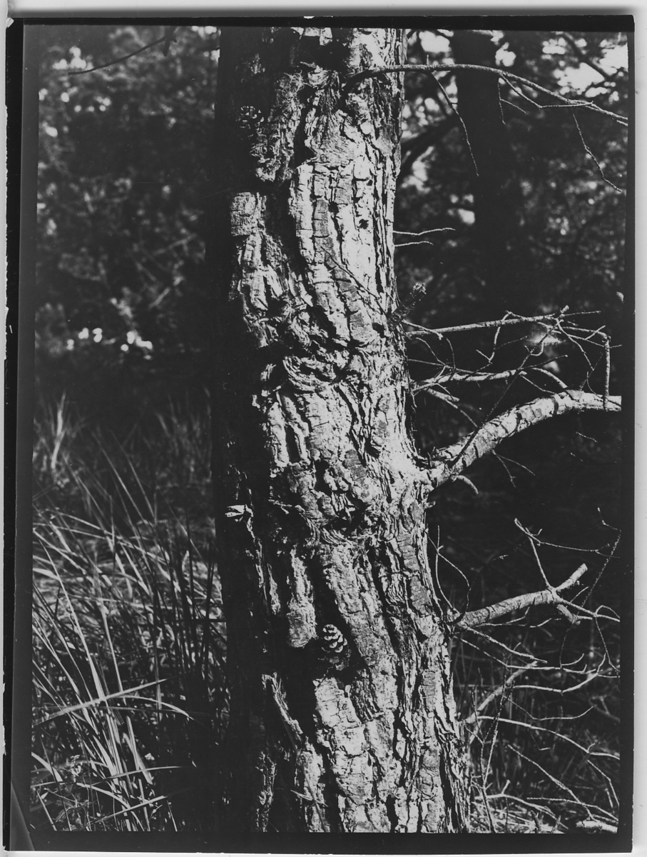 'Hackat hål av större hackspett i tallbarken, för fastsättande av tallkottar. Bildtext: ''en kotte synes längst upp till vänster''. Även en kotte nertill på stammen. :: :: :: Ingår i serie med fotonr. 2347-2399.'