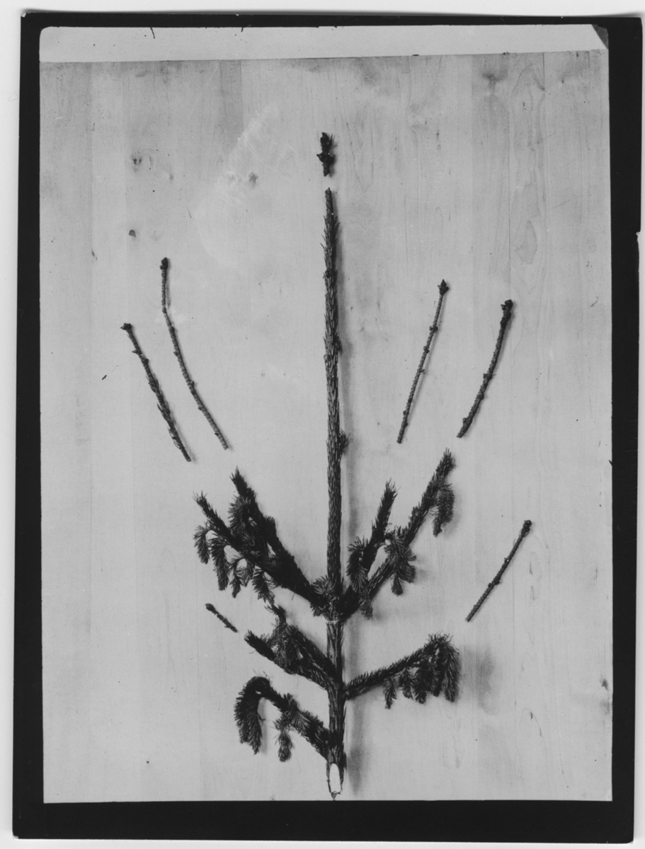 'Grantopp med avbitna skott. :: Text på baksidan: ''Toppen av 20-årig gran med av ekorre avbitna skott, prov på en skiva.'' :: :: Ingår i serie med fotonr. 2347-2399.'