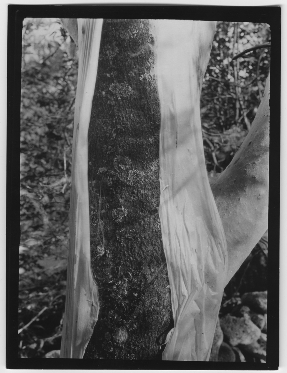 'Närbild på stam av hägg angripen av häggspinnmal. Text på baksidan: ''Häggstam omspunnen av häggspinnmal. Inspinningen uppsprättad i stammens längdriktning och vikt åt sidan.'' :: :: Ingår i serie med fotonr. 2347-2399.'