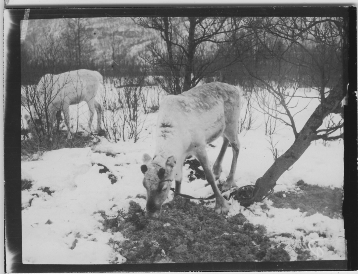 'Ätande ren bunden i ett träd, en ren i bakgrunden. Busk och trädvegetation med snötäckt mark. :: :: Se även fotonr. 248.'