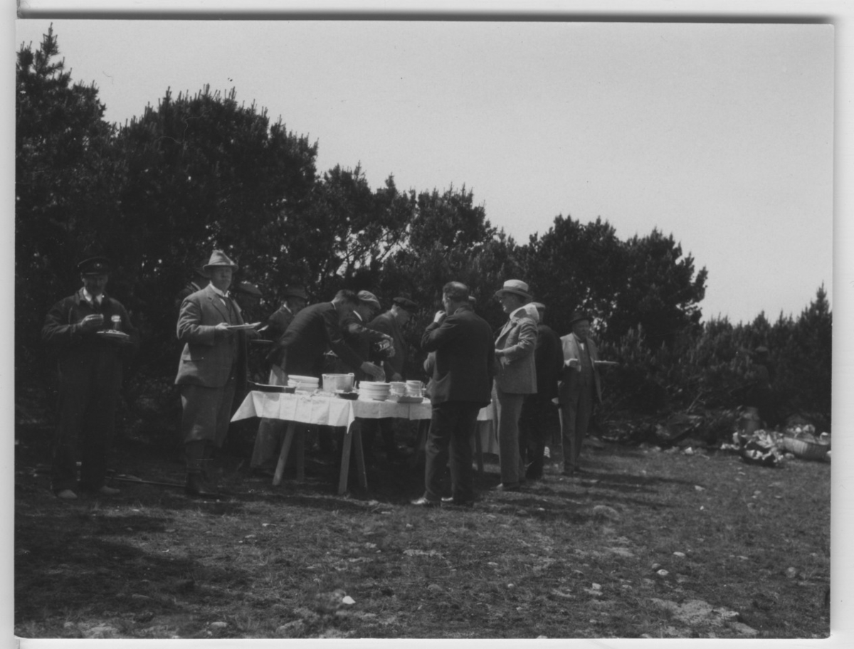 'Göteborgs Biologiska förenings utfärd till Fjärås-Onsala-Nidingen-Malön-Kalvön: :: :: Lunch på Malön, ca 13 st personer stående invid 1 dukat bord i det gröna. :: :: Se fotonr. 2489-2500 och 2501-2515 från samma utfärd.'
