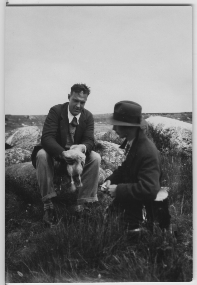'Biologiska förenings utfärd till Fjärås-Onsala-Nidingen-Malön-Kalvön: :: :: Leif Ekman och Björn Wennerberg på Malön, sitter vid stenblock. Mannen till vänster håller ung fågel. :: :: Se fotonr. 2489-2500 och 2501-2515 från samma utfärd.'