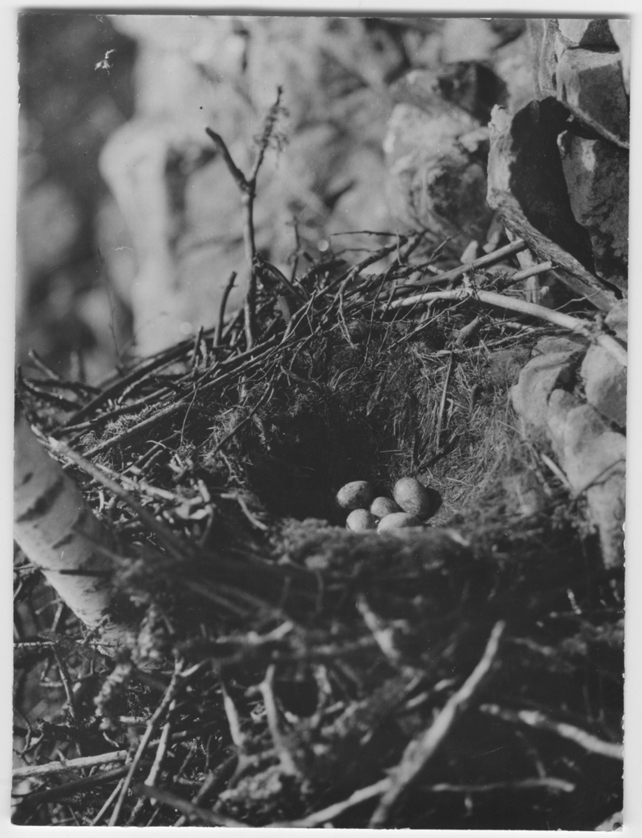 'Bo med 5 st ägg av korp. Närbild. Boet mellan björk och bergvägg. :: :: Ingår i serie med fotonr. 2524-2557.'
