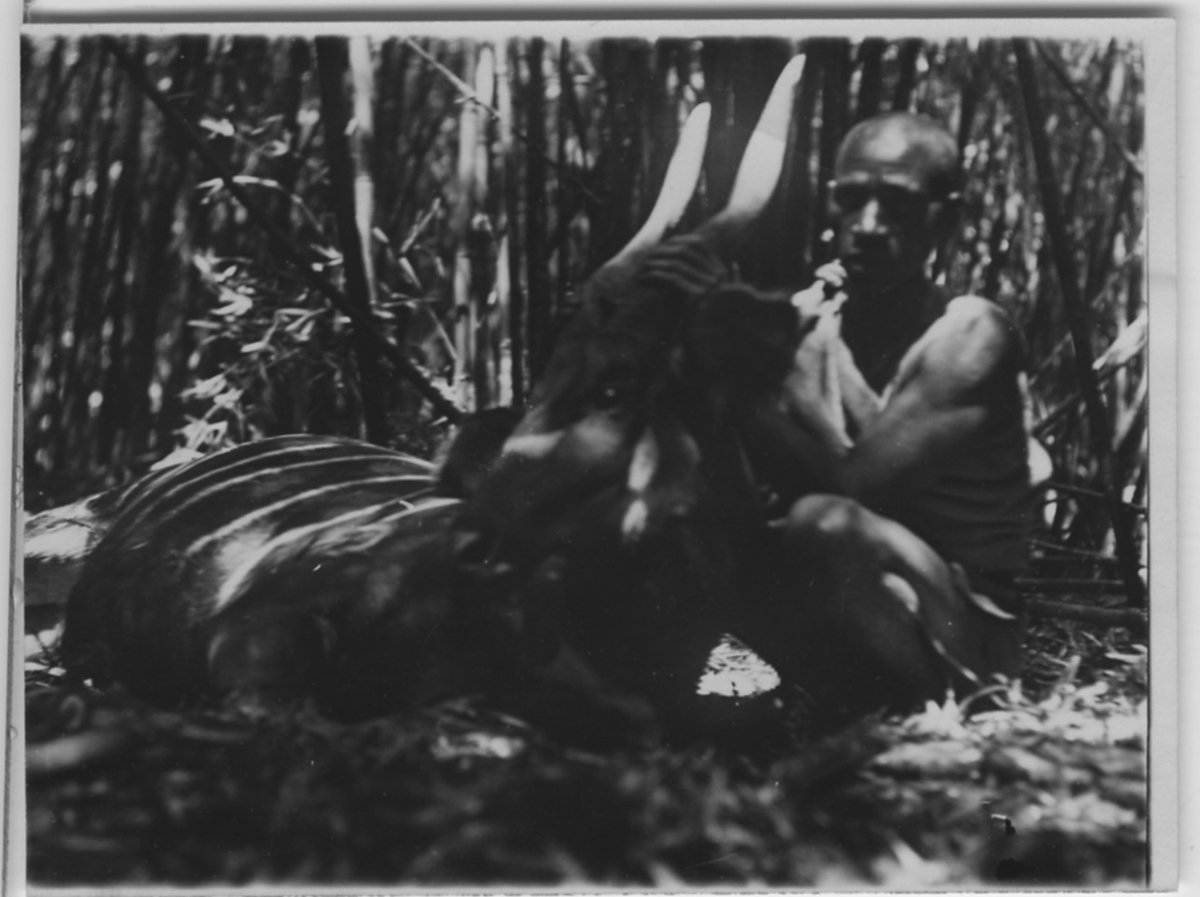 Fälld skogsantilop (Bongoantilop), 1 person håller upp djurets huvud.