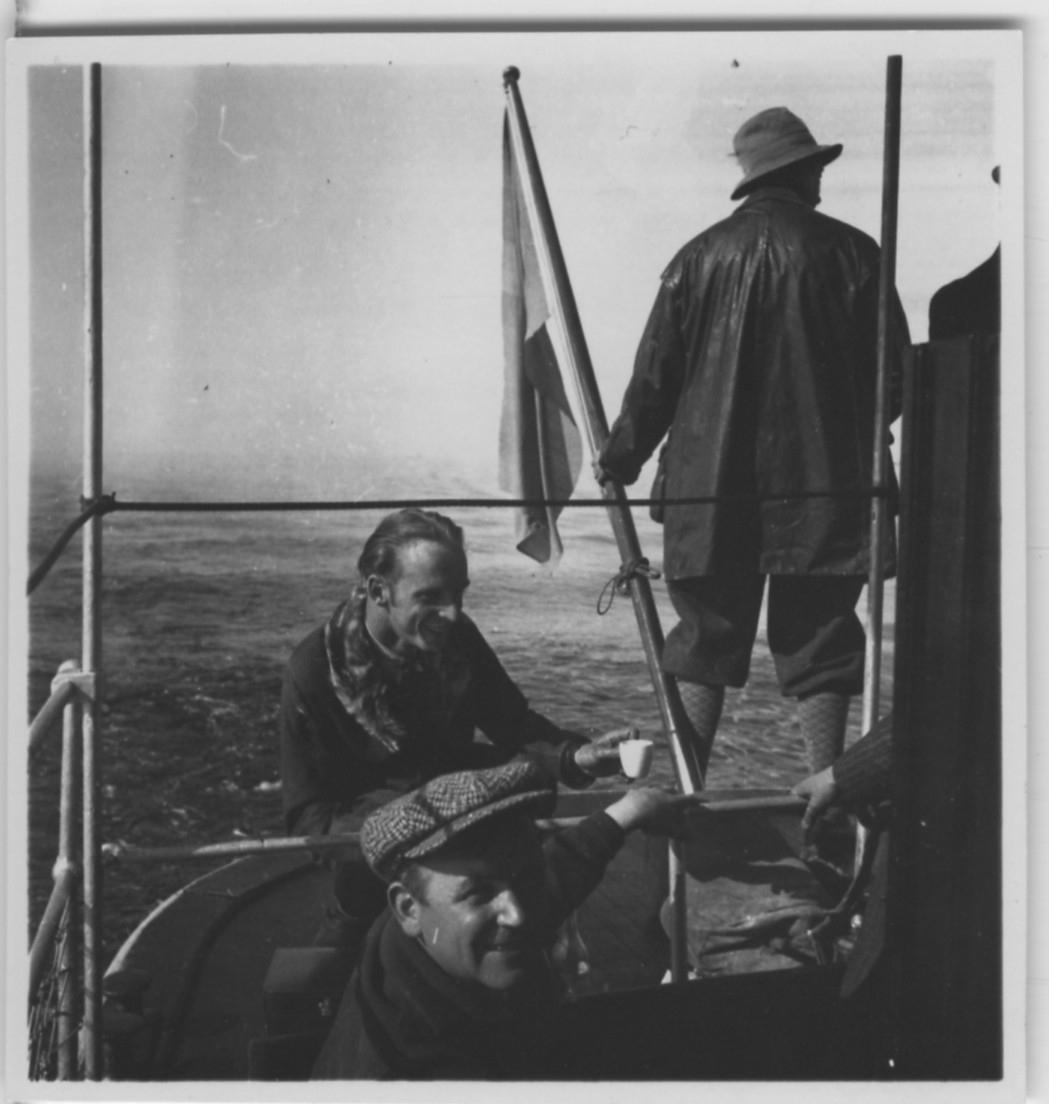 'Biologiska föreningens utfärd till Läsö och Nordre Rönner: :: :: ''J. Lagerberg stående'' vid flagga, Björn Wennerberg, konservator G. Rosén, ombord på båtdäck. :: :: Se fotonr. 2674-2734, 2687-2691, 2692-2711, 2714-2734, 2843-2863 och 2975 från samma utfärd.'