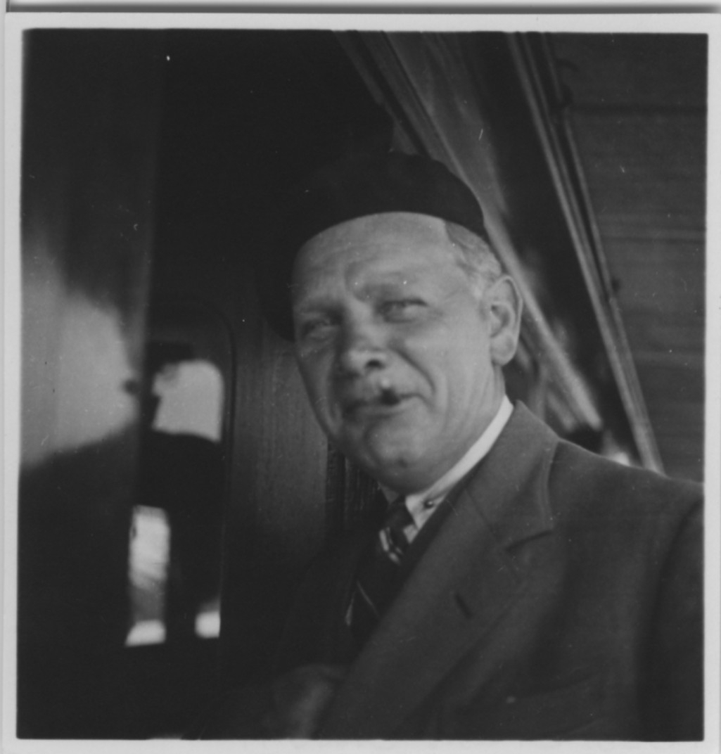 'Biologiska föreningens utfärd till Läsö och Nordre Rönner: :: :: Arkitekt C.O. Svensson ombord på båten ''BRIS'', närbild , cigarr i munnen. Iklädd mössa. :: :: Se fotonr. 2674-2734, 2687-2691, 2692-2711, 2714-2734, 2843-2863 och 2975 från samma utfärd.'