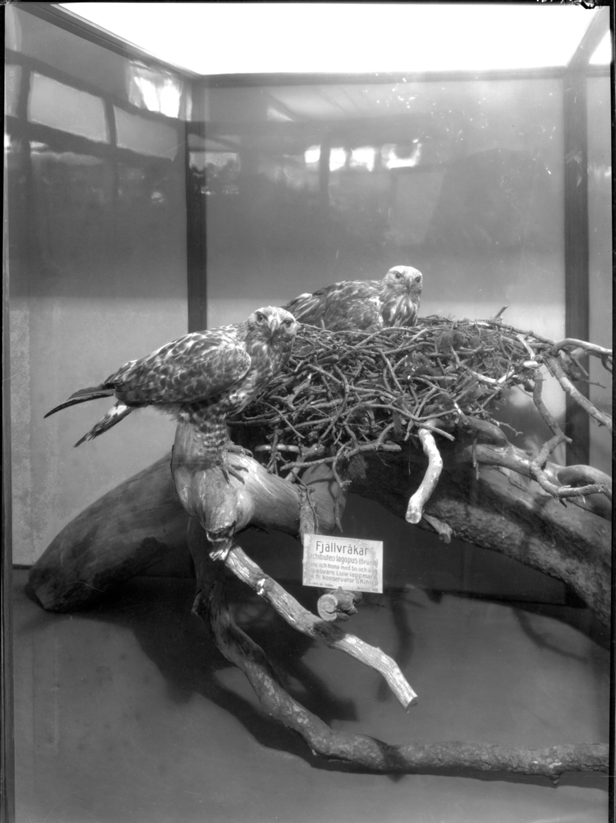 'Biologisk grupp med fjällvråkar, utställda i fågelgången avdelningen för biologiska grupper. 2 fjällvråkar på boet. :: :: Ingår i serie med fotonr. 2735-2769.'