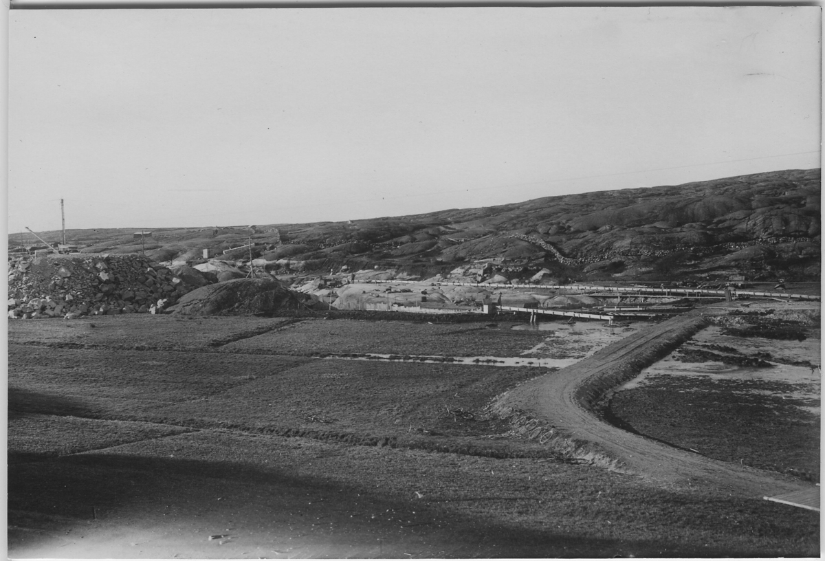 'Från grävningarna i Sotenkanalen: platsen för de fossila benfynden. Vy, ''det nya fjärrfotot å garfågelholmen''. :: :: Vy över grävplatsen med människor och maskiner, redskap på avstånd. :: :: Serie fotonr 2773-2778, bilderna är monterade på papper som har utförlig text, se fotonr. 2775:2. Liknande motiv som fotonr. 2776.'