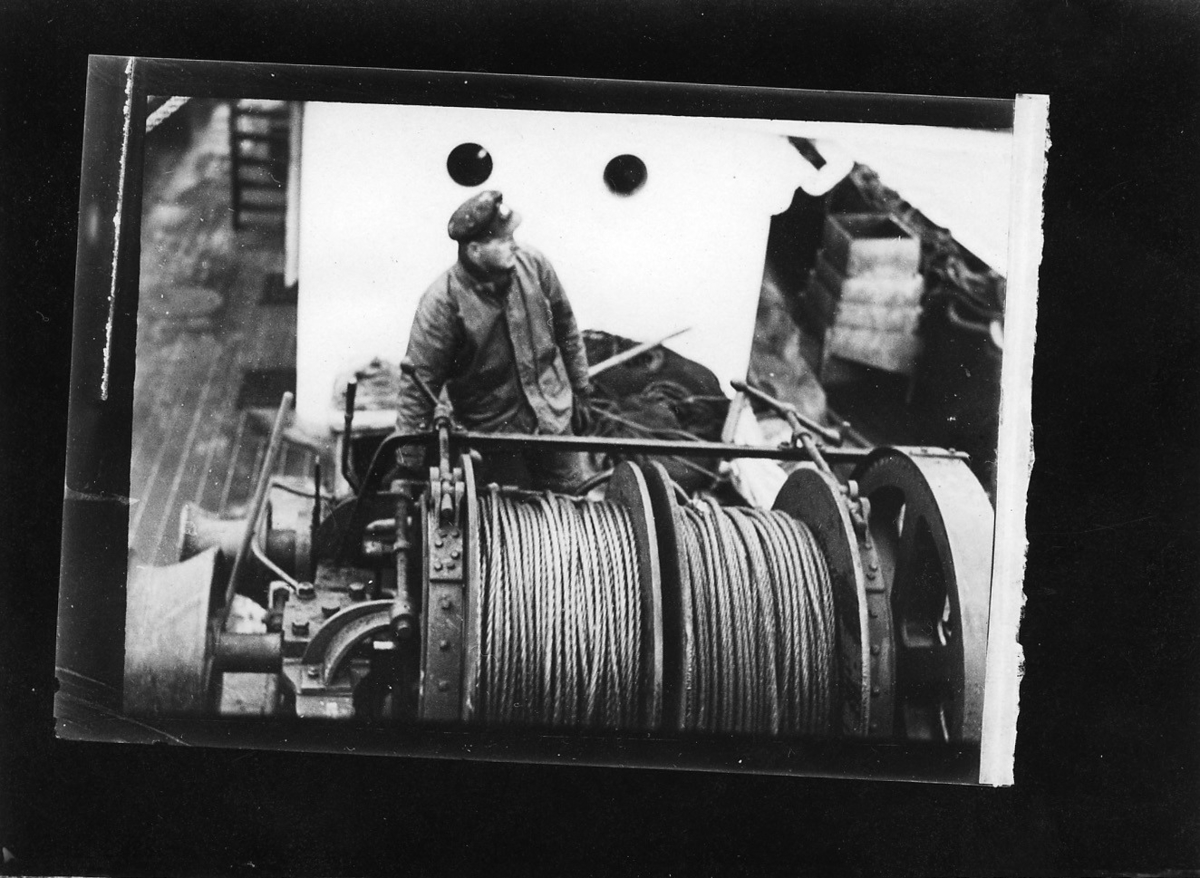 'Skagerrakexpeditionen 1933-03-06 - 1933-03-08: :: :: 1 st man, båtsman, vid spelet på båten ''Skagerak''. Iklädd skärmmössa. Vevar. :: :: Ingår i serie med fotonr. 2804-2826.'
