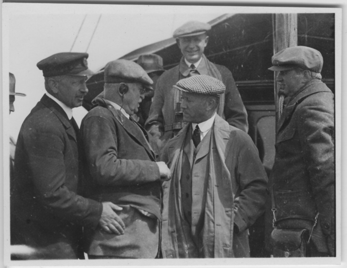 'Biologiska föreningens utfärd till Läsö och Nordre Rönner: :: :: 7 st män ombord på båtens däck. ''Från vänster: direktör Egnell, Leonard Axel Jägerskiöld, Lind, Hultman och Frumerie på väg till Läsö.'' :: :: Se fotonr. 2674-2734, 2687-2691, 2692-2711, 2714-2734, 2843-2863 och 2975 från samma utfärd.'