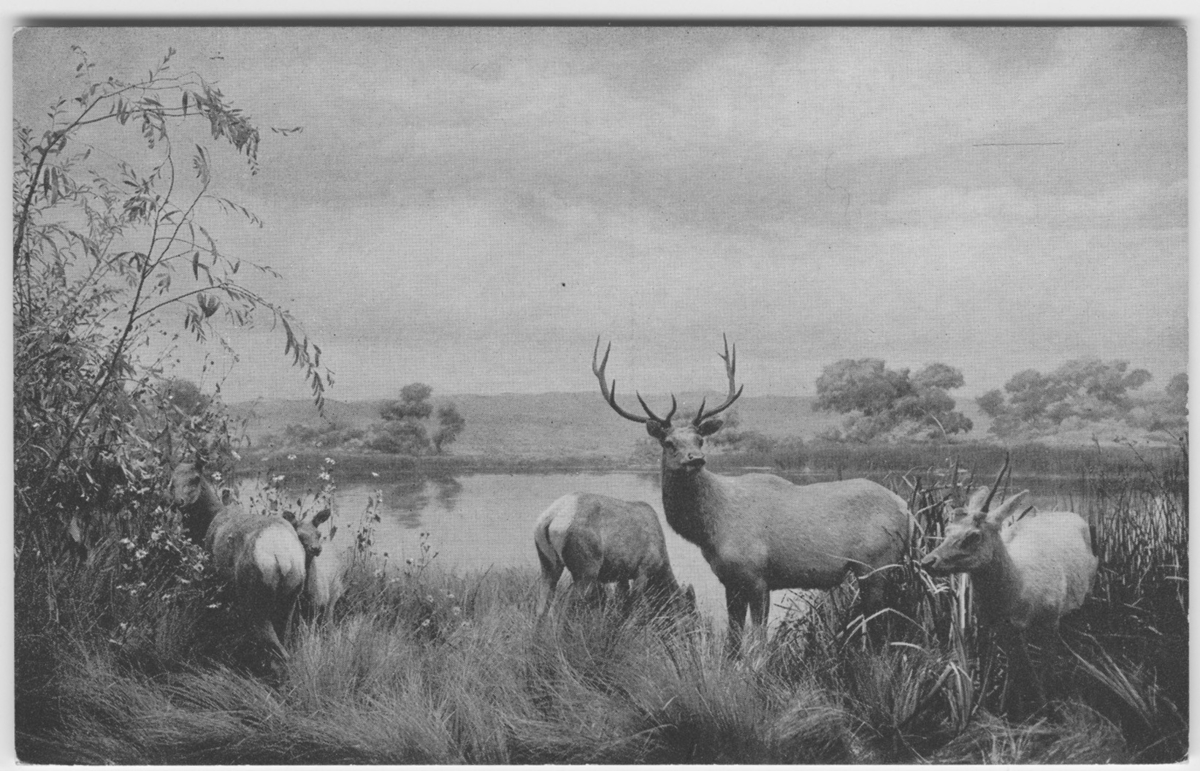 '6 hjortar vid vatten. Text på baksidan: ''San Joaquin valley elk group.'' :: :: Ingår i serie med fotonr. 2915-2929, se även fotonr 2914:2.'