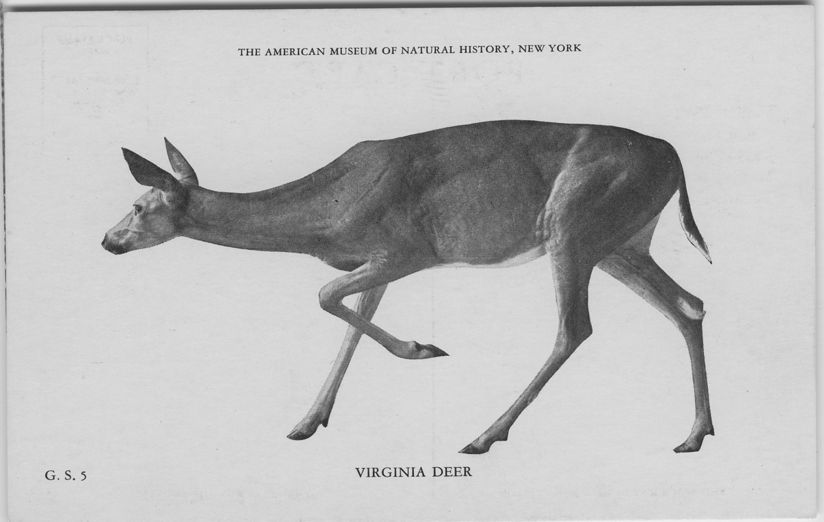 'Hjort i närbild. Text på baksidan: ''Virginia deer. ''Best known of our wild, hoofed animals. Ranges in nearly every state in the union. Most abundant in New York, Maine and Vermont.'' :: :: Ingår i serie med fotonr. 2941-2954. Se även serie med fotonr. 2930-2940.'