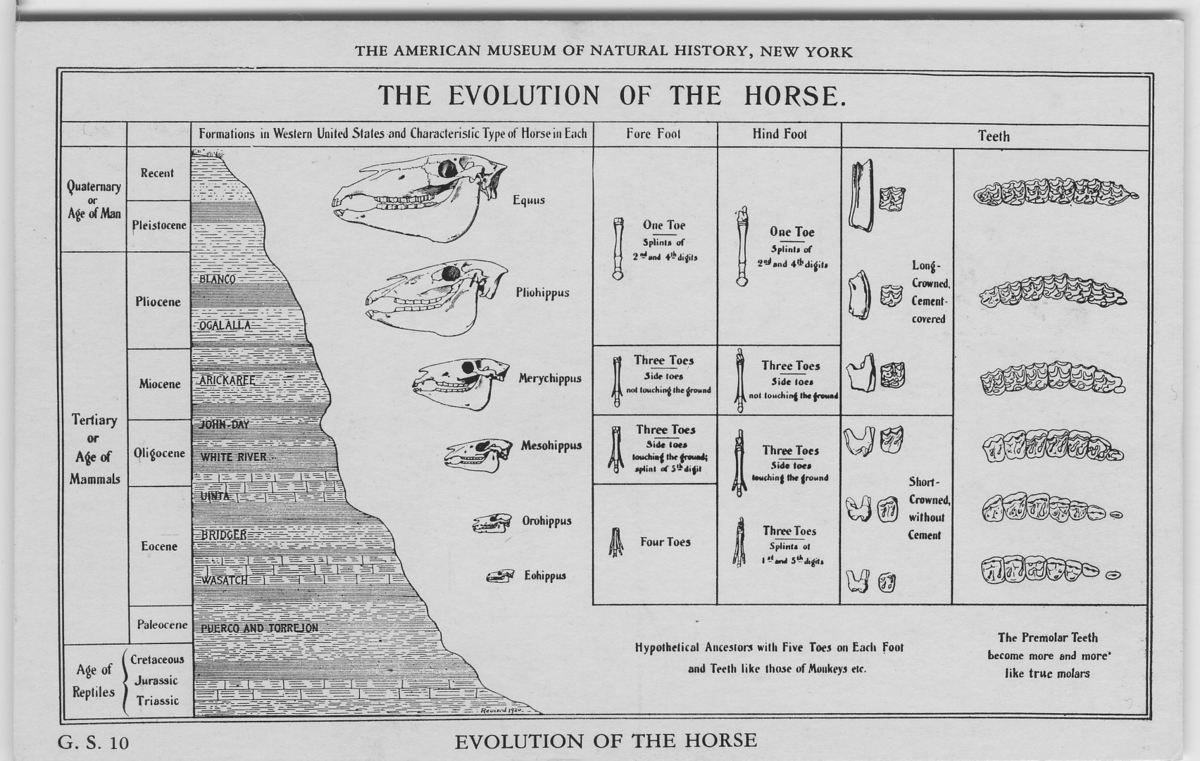 'Hästens utveckling, schema.Text på baksidan: ''Evolution of the horse.'' :: :: Ingår i serie med fotonr. 2941-2954. Se även serie med fotonr. 2930-2940.'