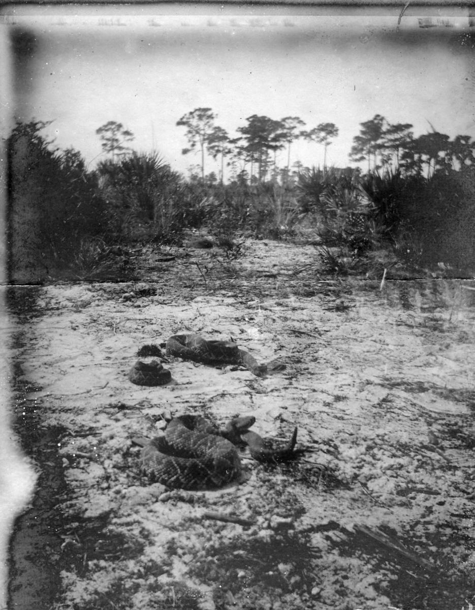 Skallerorm, 3 stycken på öppen sandig mark. Vy med barrträd i fonden.