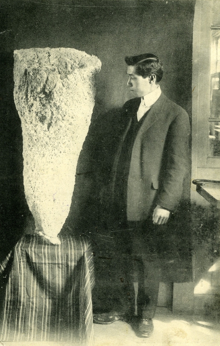 Jättesvamp, största kända Hexactinellida svampdjuret, 3 feet och 11 inch, stående på ett bord. 1 man håller i jättesvampen.
