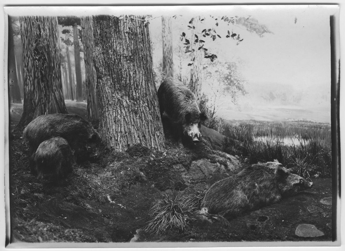 'Vildsvinsgrupp, 4 djur, i skogsbryn. :: :: Ingår i en serie fotonr. 3096-3108 med 12 st fotografier av dioramorna i Zoologiska museet i Berlin och fotonr. 3109-3120 med 12 st fotografier av dioramorna i Hermann-Roemer-museet, Hildesheim.'