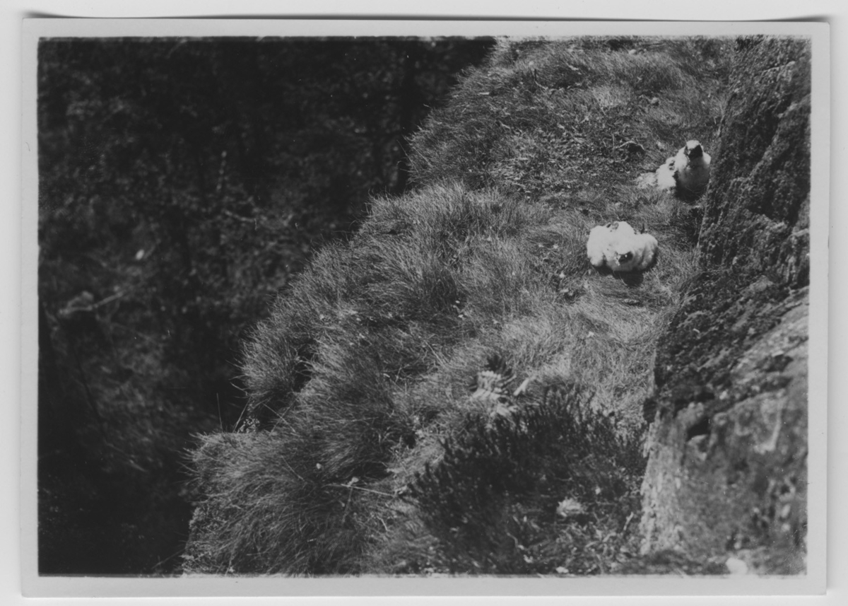 'Pilgrimsfalk, 3 st ungarna vid boet. :: :: Text på baksidan ''Regn och starkt solsken tyckte ungarna inte om. Honan kom då (medan de äro små) ... Och tog dem under sina vingar. När hon längre fram delltog i jakten finge ungarna reda sig själva.'' :: :: Se serie med fotonr. 3151-3200. Se även fotonr. 1771-1837.'