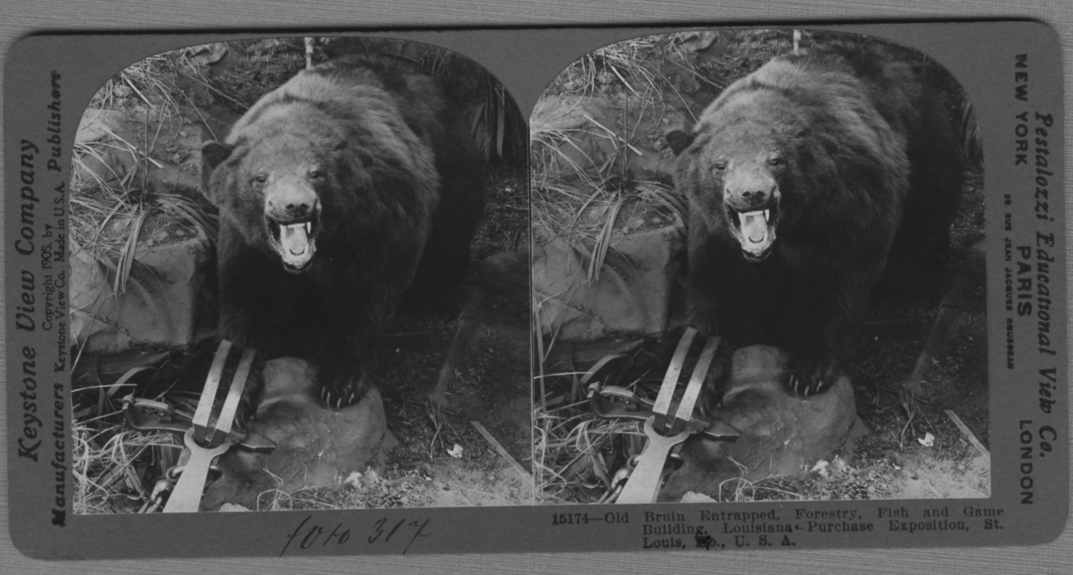 'Björn fångad i en björnsax. :: :: ''15174 - Old Bruin entrapped, forestry, fish and game building, Louisiana, purchase exposition, St Lois, U.S.A.'' :: :: Ingår i serie med fotonr. 315-422.'