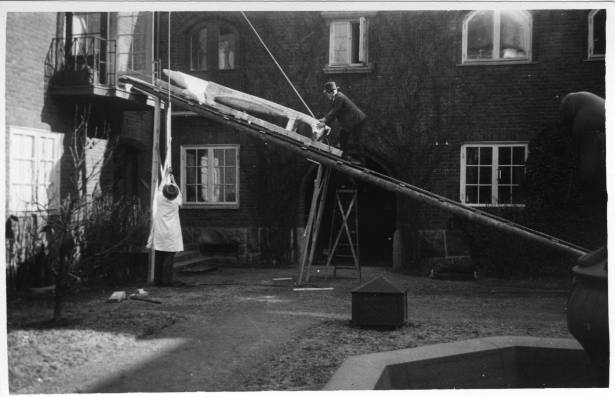 '2 män i arbete men att få upp gipsavgjutning, av halvspäckhuggarhane 3,69 m lång för en ramp, in genom en balkongdörr i museibyggnaden, in i ateljén. :: :: Ingår i serie med fotonr. 3241:1-5.'
