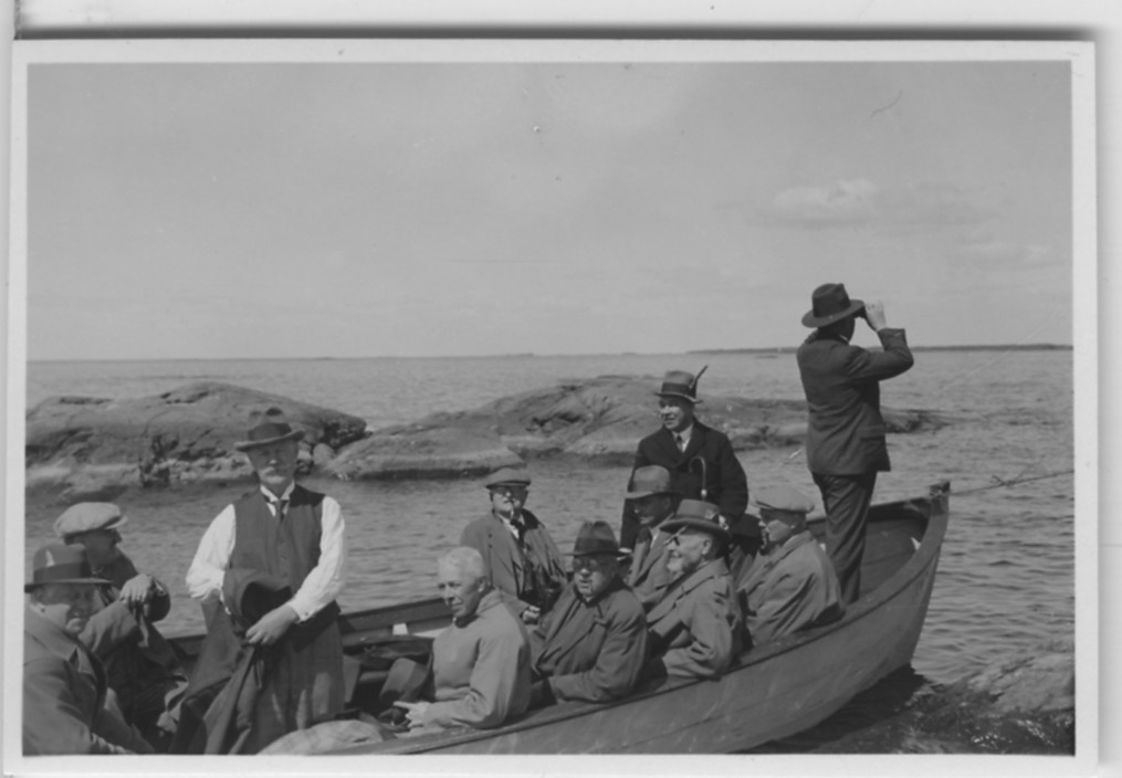 'Biologiska föreningens utfärd till Läckö och Ekens skärgård: :: :: 11 män i båt, vy ut mot öppet vatten, sjö med bergshällar i bakgrunden. Text enligt foto: ''en av båtarna utanför pilgrimsfalkens boplats på Milskär.'' :: Leonard Axel Jägerskiöld sittande i mitten av båten, bakre raden, pipa i munnen. :: :: Se fotonr. 3242-3254, 3255, 3256-3259, 3260-3285 samt 3889-3894.'