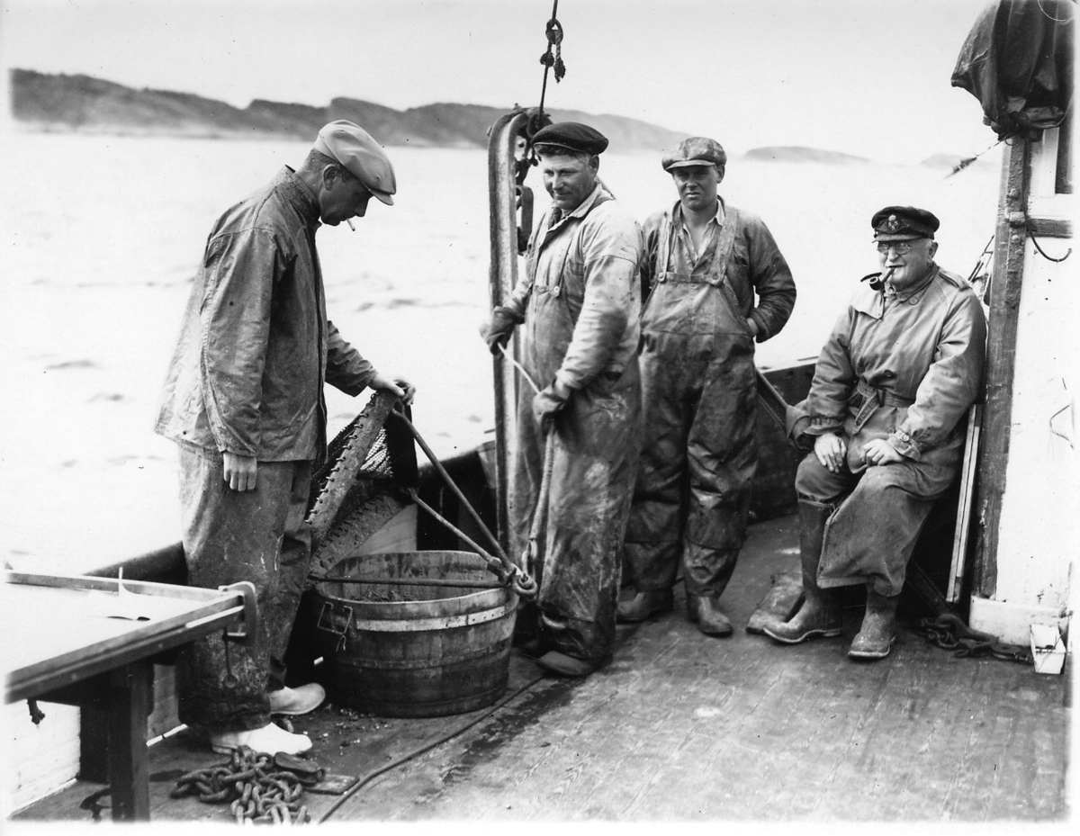 'Naturhistoriska muséets Skagerackexpedition med båten Skandia sommaren 1934: :: :: 4 män på Skandias däck, 1 man tömmer stor håv i trätunna. Leonard Axel Jägerskiöld sittande till höger. :: :: Ingår i serie med fotonr. 3309-3317.'