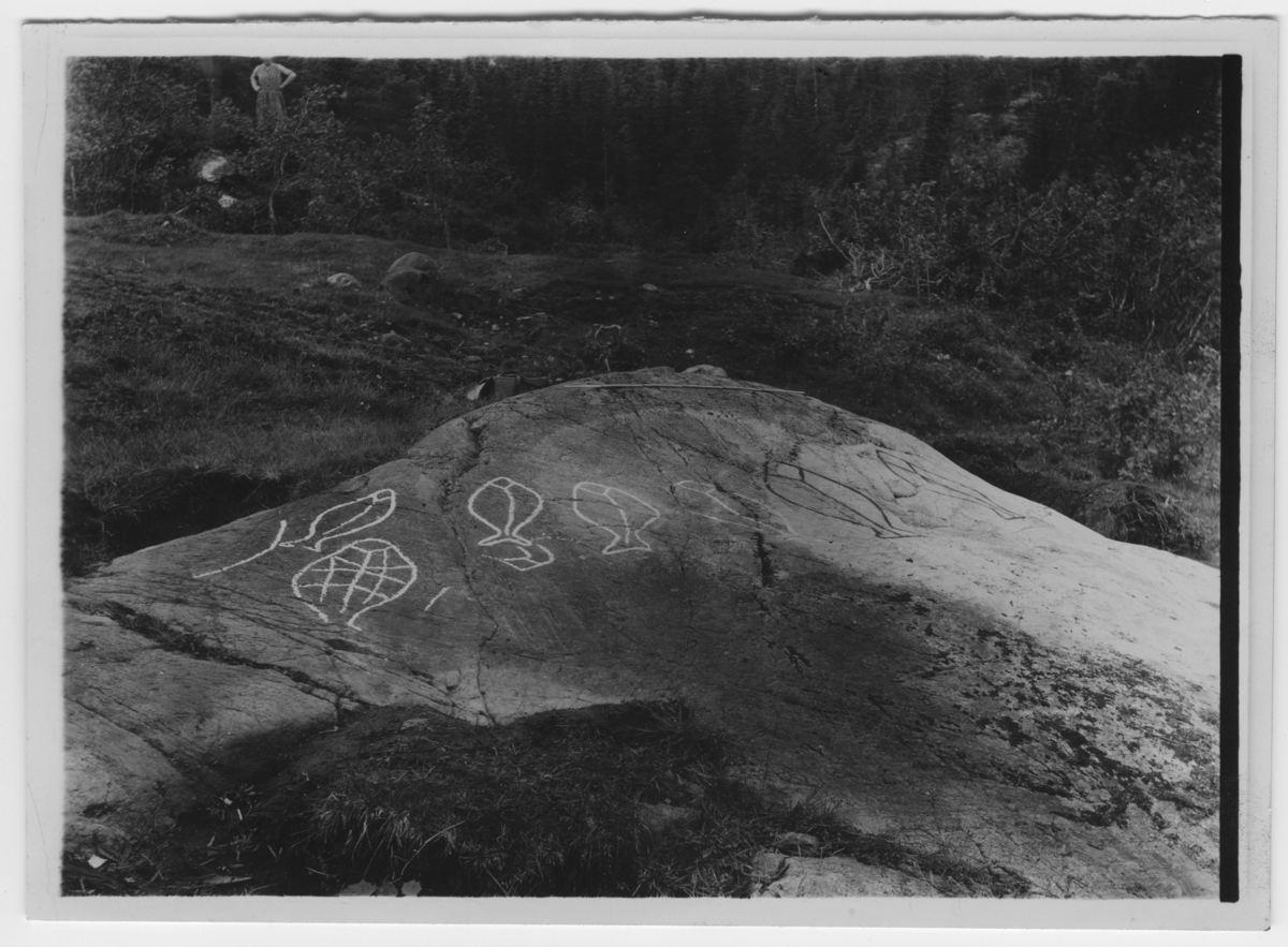 Hällristningar på berghäll i Kverneviken, häll med stora flatfiskar