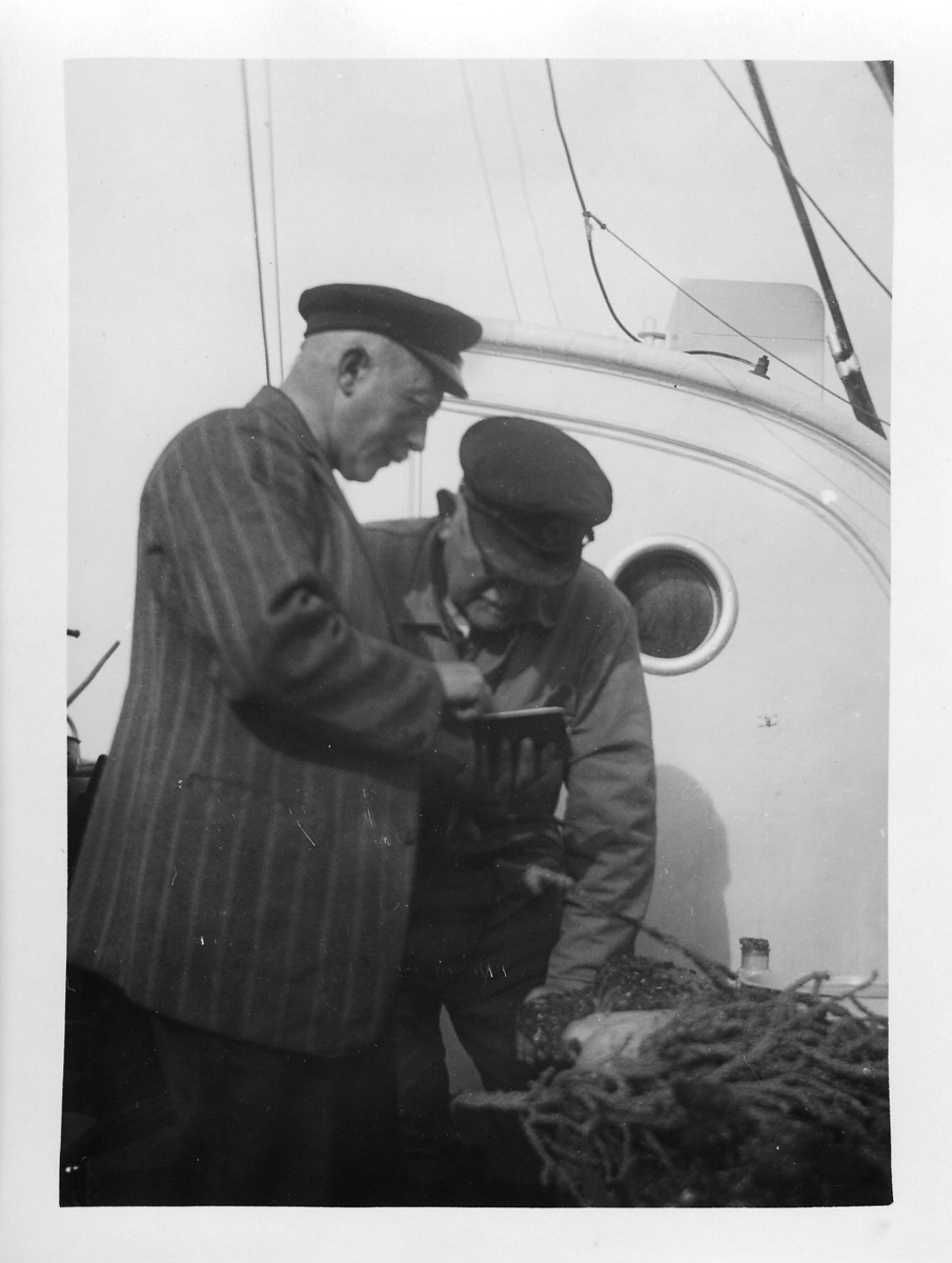 'Museibestyrer Carl Dons (till vänster) och professor Leonard Axel Jägerskiöld ombord på däcket på ''Gunnerus''med korallfynd. :: :: Ingår i serie med fotonr. 3349-3356.'