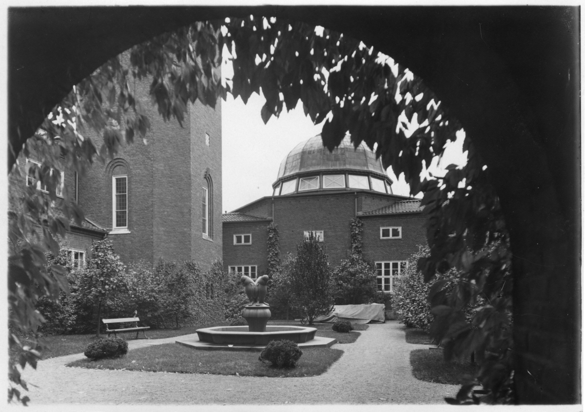 Bilden tagen inifrån kopparporten mot innergården och dioramatornet. Med pingvinfontänen. Trädgård.